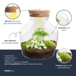 With a plant terrarium, you not only bring a unique eye-catcher into your home but also a piece of tranquility and nature that sustains itself. This mini jungle in glass is perfect for anyone who loves greenery but lacks time or a green thumb. Thanks to the closed ecosystem, the terrarium largely regulates its own water and humidity. Watering is often needed only once or twice a year. This way, you can effortlessly enjoy vibrant greenery without hassle. Place the terrarium in your living room, on your desk, or give it as a gift; it instantly adds atmosphere and a refreshing feel to any space. This way, you can enjoy greenery endlessly and carefree at home or in the office. All the joy, none of the effort! Add this terrarium to your shopping cart and start enjoying your own mini ecosystem tomorrow!