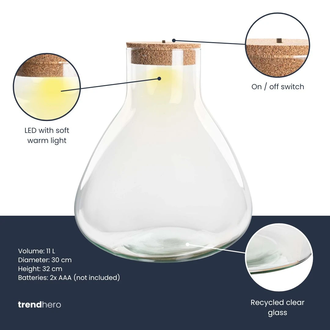 Bring greenery and ambiance together with the Sam XL. This large recycled glass model comes with a natural cork stopper and includes an LED cork that emits a soft, warm glow. Fill the bottle with moss, succulents, or air plants and enjoy a low-maintenance eye-catcher in your home. Check out our selection of terrarium starter and refill kits.